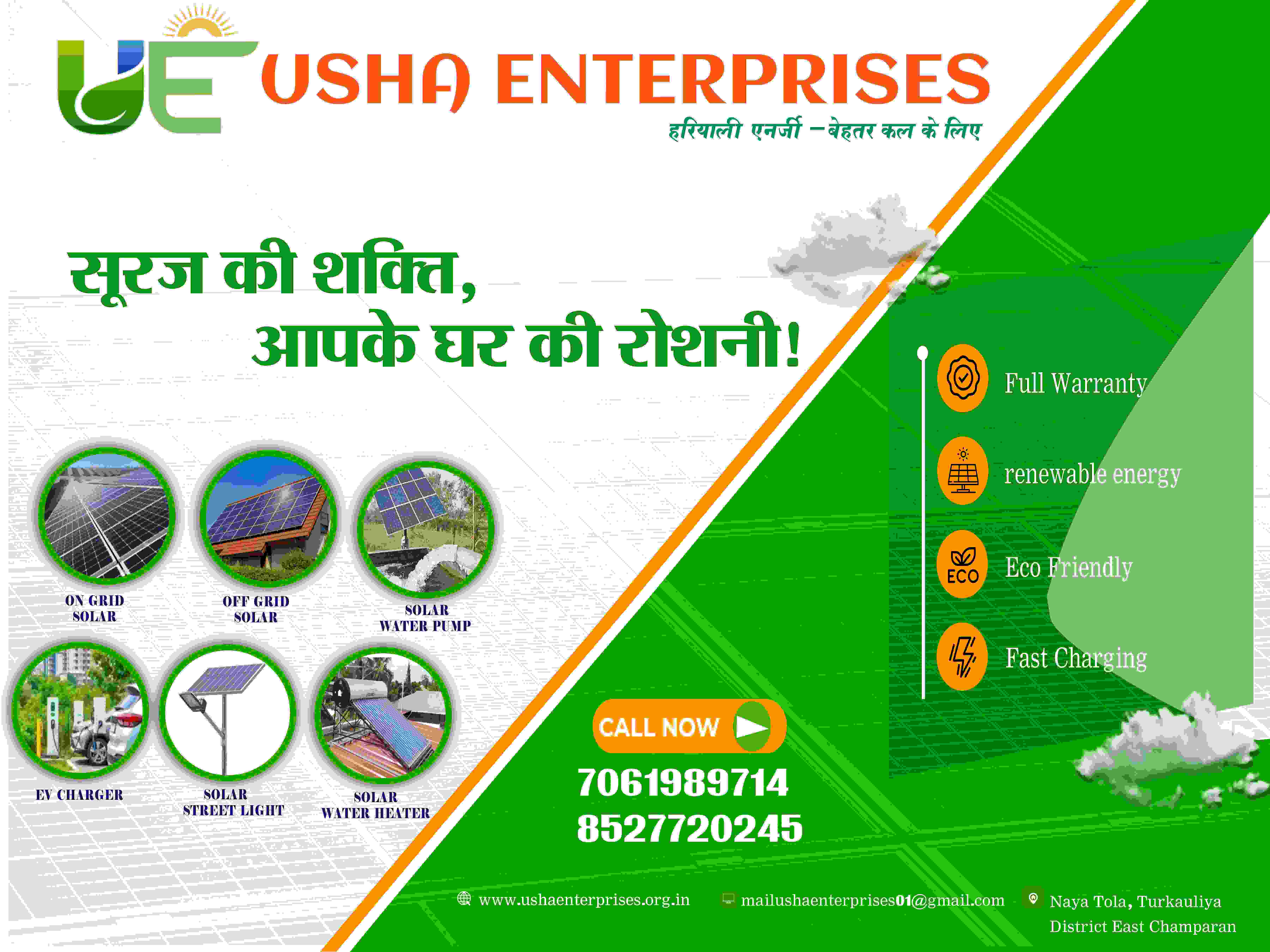 The future is clean, sustainable, and powered by the sun! At [Usha Enterprises], we are committed to delivering reliable and cost-effective solar energy solutions for homes, businesses, and industries.
